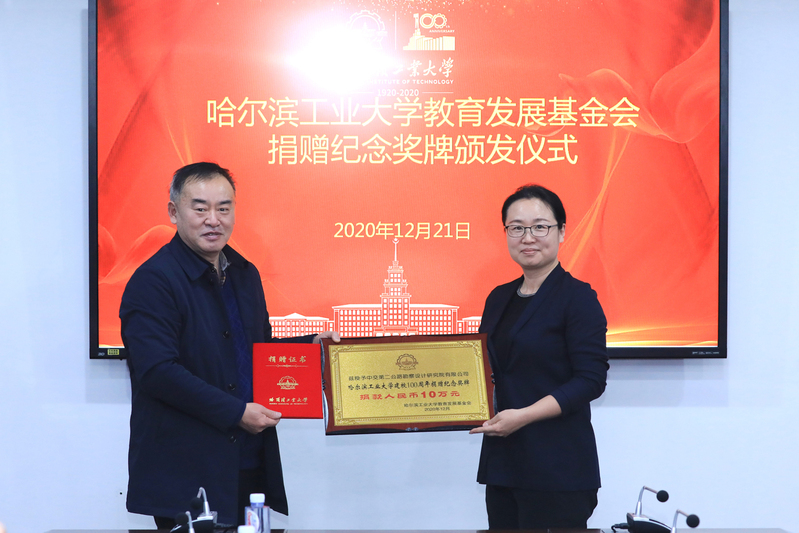 哈工大报讯(季萱/文 辛然/图)12月21日,哈工大教育发展基金会捐赠纪念奖牌颁发仪式在行政楼333会议室举行。中交第二公路勘察设计研究院有限公司向哈工大教育发展基金会捐赠人民币10万元,用于奖励土木学院、交通学院、电信学院、建筑学院、计算学部的优秀研究生。基金会副理事长、校党委常委、组织部部长孙雪为捐赠单位颁发捐赠纪念奖牌和证书。