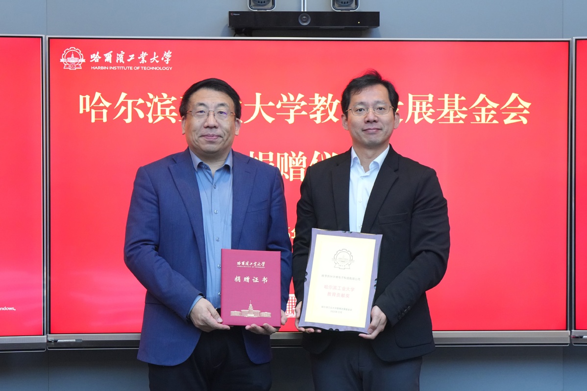 哈工大全媒体(阚思邈/文 辛然/图)1月8日,哈工大教育发展基金会捐赠仪式举行。苏州华博电子科技有限公司(以下简称“华博电子”)向基金会捐赠,用于支持电子与信息工程学院学科发展建设。副校长刘挺为华博电子颁发教育贡献奖奖牌和捐赠证书。